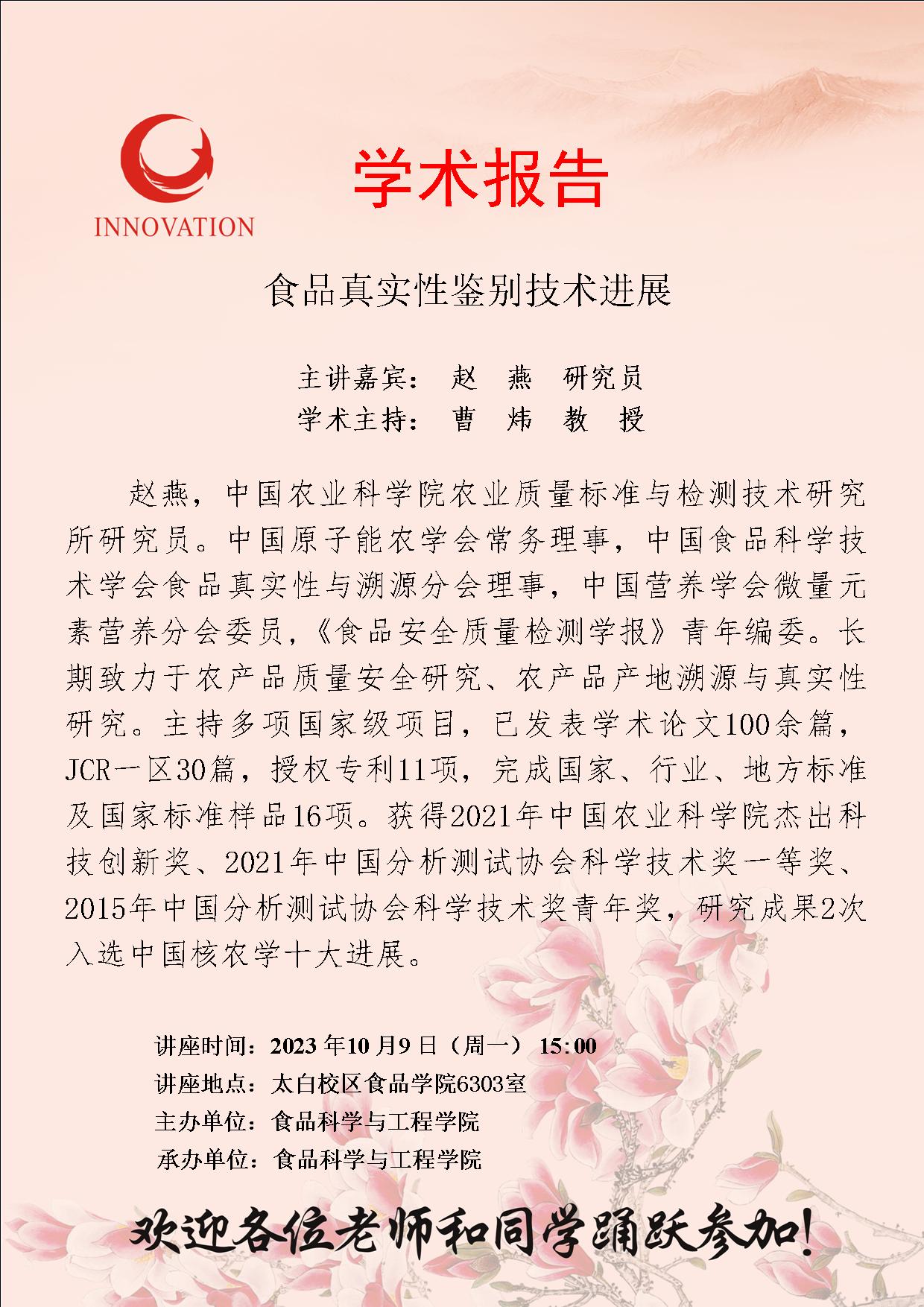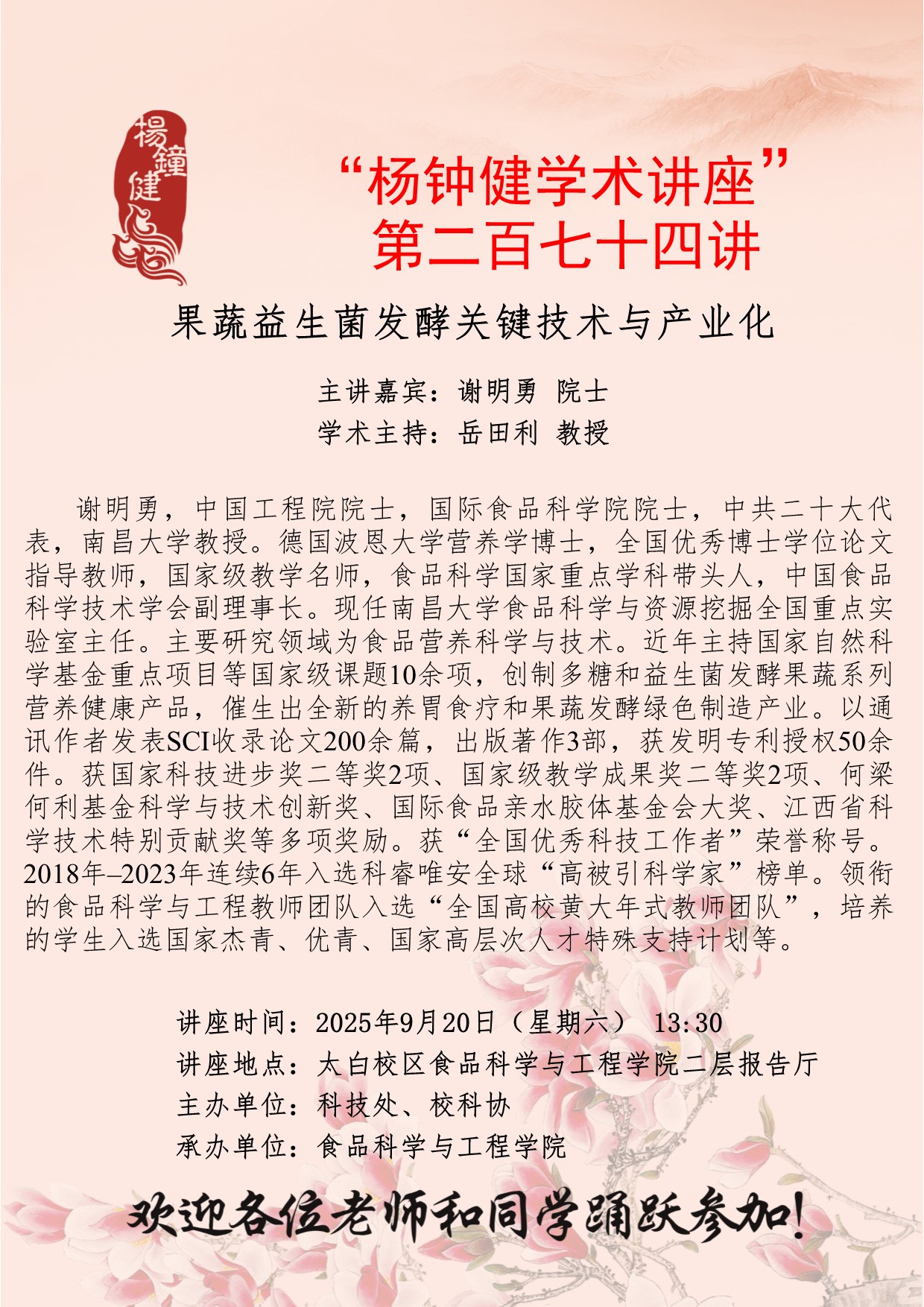 学术报告 “杨钟健学术讲座”第二百七十四讲 果蔬益生菌发酵关键技术与产业化