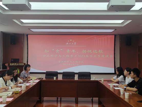 为进一步加强与毕业生的交流,倾听了解毕业生建议,6月7日上午,公司在六号楼303会议室召开主题为“知食青年、扬帆起航”的2023届毕业生座谈会。公司党委书记刘晓忠、副书记张霄、教师代表高慧教授、毕业班班主任、辅导员郭森、高会洲、周炳莹、教务管理老师刘清清、马天琛及2023届本科毕业生参加会议。会议由党委副书记张霄主持。