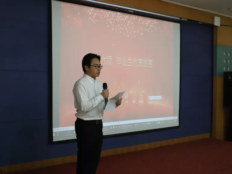 赵磊同学代表2019届毕业生发言,她向公司及各位老师表示了诚挚的谢意,用淳朴温暖的语言回顾了大学四年学习,生活的点滴,讲述了公司、公司的巨大变化和带给自己的改变,同时表达了对公司和公司的依依不舍。